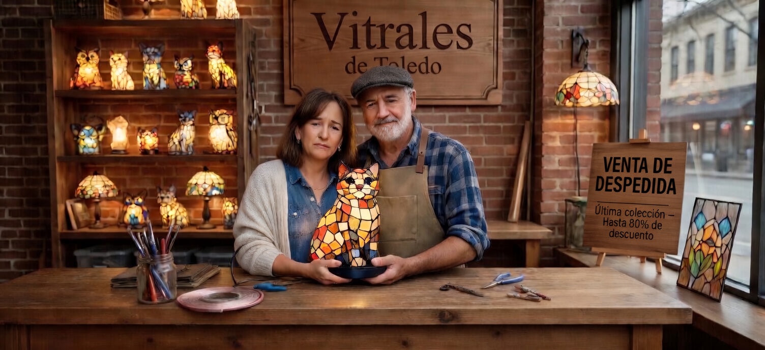 En 2012, en un pequeño rincón de Toledo, Elena y Mateo decidieron abrir su tienda artesanal.Un lugar donde el arte del vitral pudiera dar luz y vida a cada hogar.